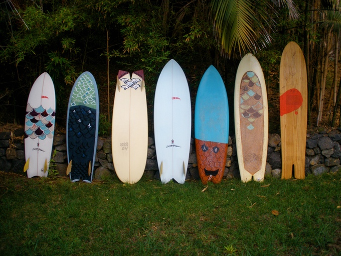 Surfboards shaping experiments, using sugar cane foam, paulownia veneer, plywood scrap, hemp fabric and pine sap epoxy.